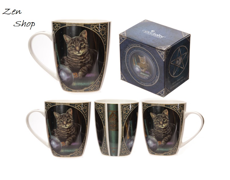 Κούπα της Lisa Parker από πορσελάνη υψηλής ποιότητας με κελτικές μπορντούρες και γάτα με κρυστάλλινη σφαίρα.