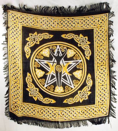 Με το σύμβολο της πεντάλφας και της Μητέρας Θεάς στο κέντρο, πλαισιωμένη από κελτικές διακοσμητικές μπορντούρες και κρόσια στο τελείωμα.